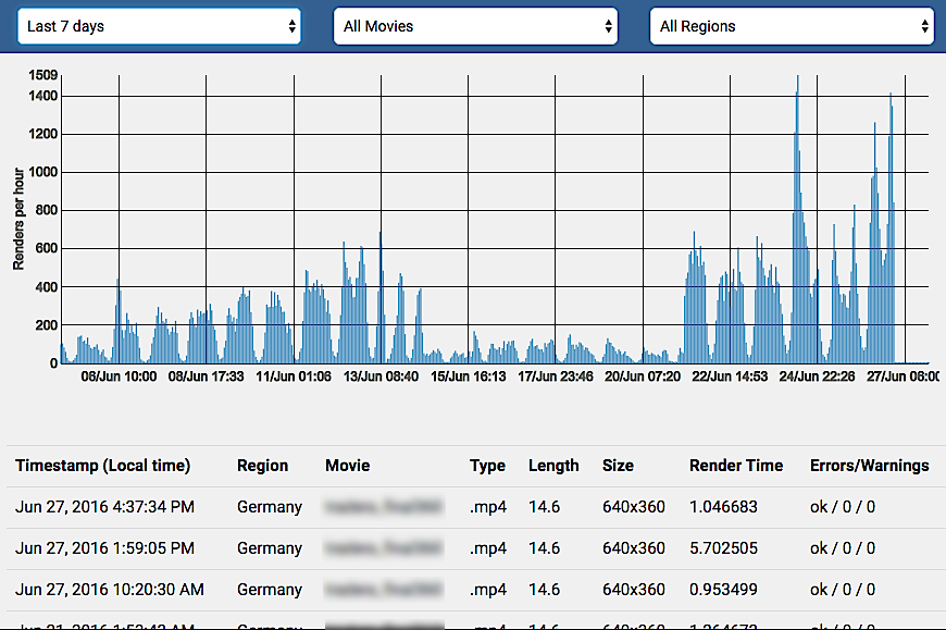 Analytics provide you with insights to details of each rendered video or image. By tracking key metrics, you can measure volume, video and image formats, render timings, number or errors and warnings.